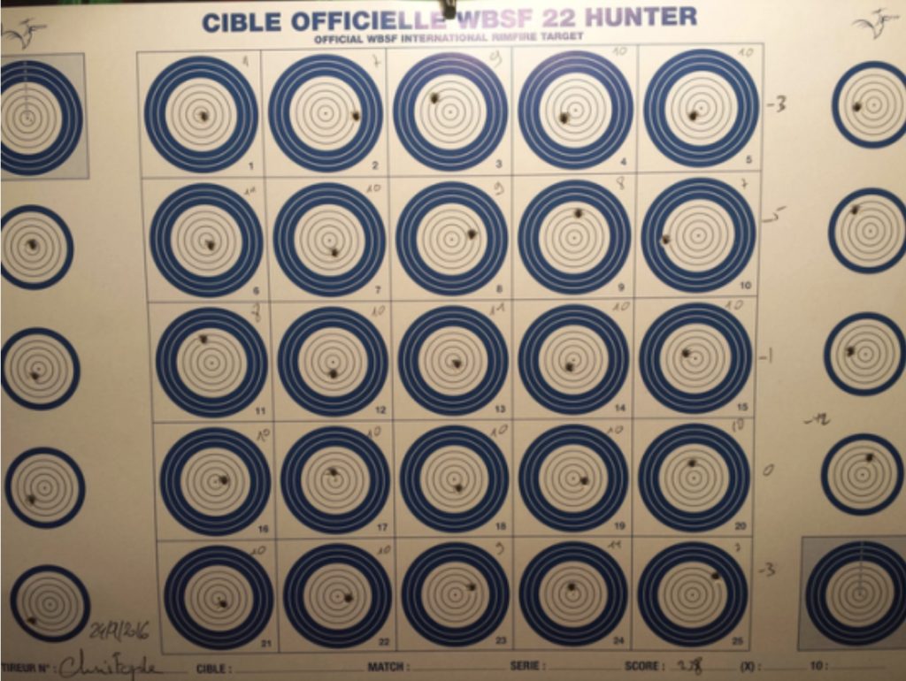 Le Hunter est une discipline qui se pratique à 50 mètres avec une carabine .22lr. L’arme est posée sur des supports et équipée d’une lunette. L’objectif est de totaliser le maximum de points en additionnant le total des 25 cibles.